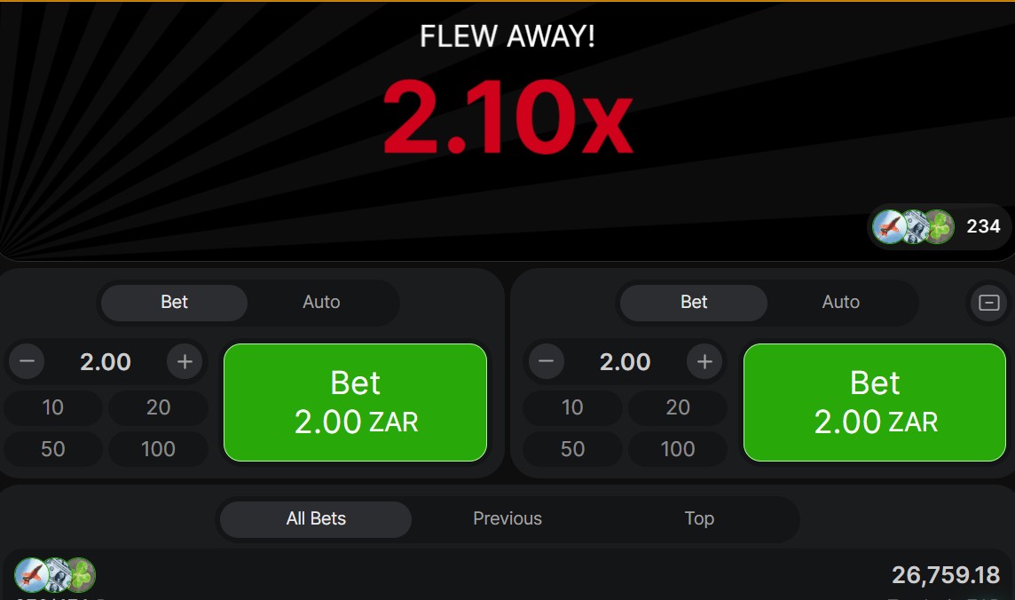 Betting ranges from R0.20 up to R2,000 per bet (with two bets, you can wager up to R4,000 per round), with an outstanding RTP of 97% – one of the highest in online gaming! The multiplier has no theoretical limit, meaning wins can reach extraordinary heights, though most rounds end between 1.5x and 3.00x.